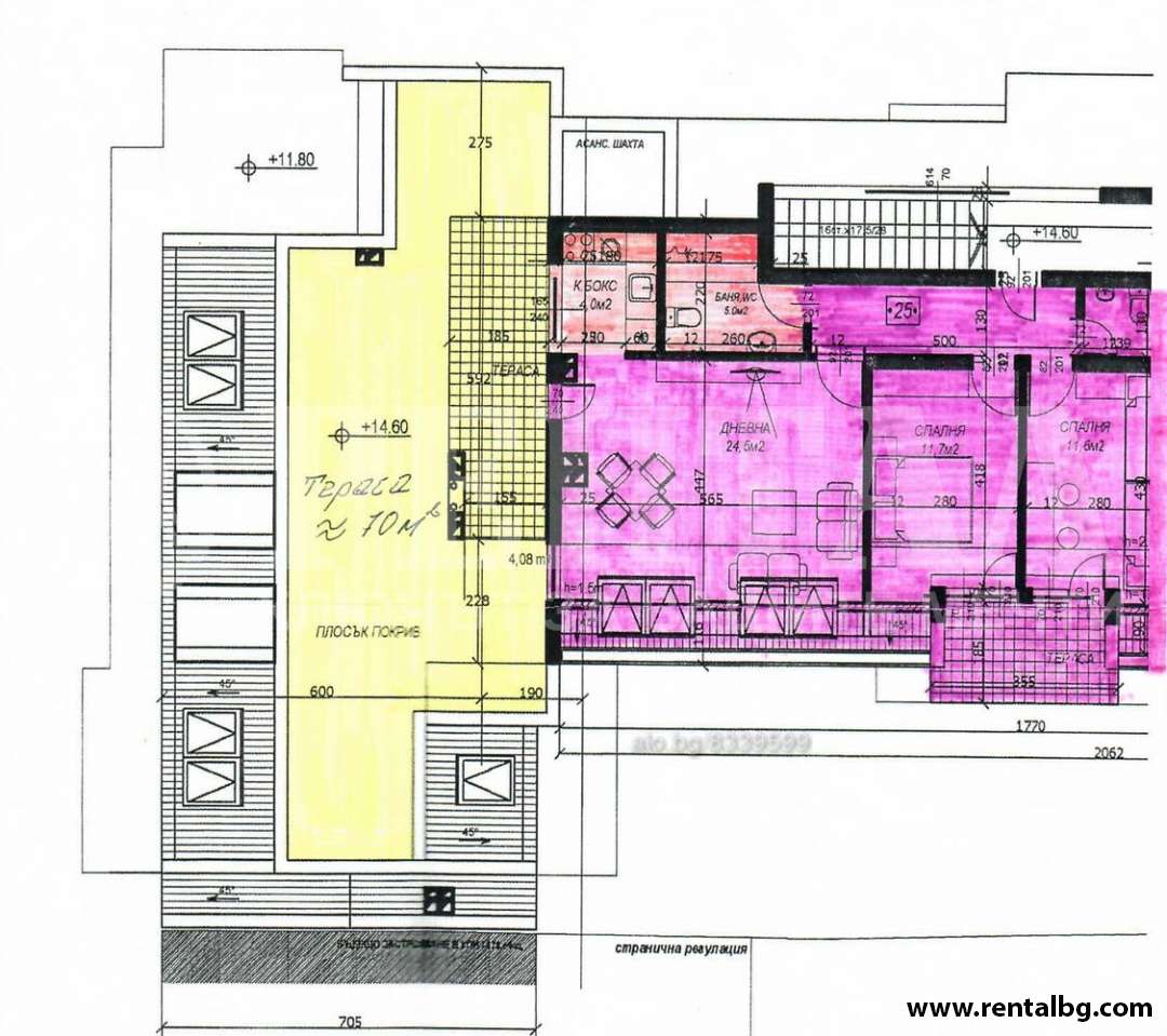 Изложение юг-запад. Състои се от 2 спални, хол с бокс, 2 тераси, склад. Застоена площ без терасите 77кв.м. и тераси 87кв.м.