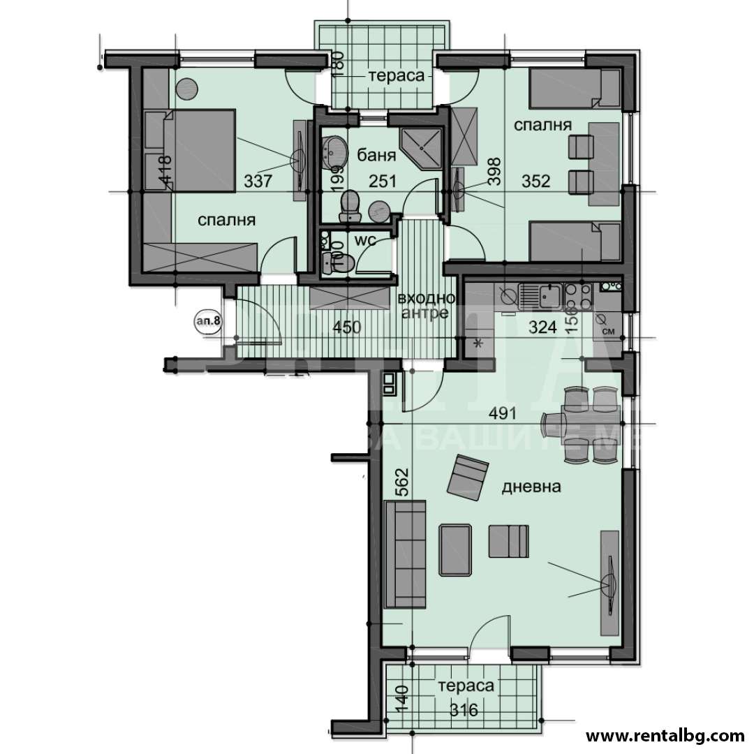 оферта 238145 пред АКТ 16! Предлагаме просторен апартамент с южно изложение с жилищна площ 101,50 кв.м. Състои се от прекрасен дневен тракт, две спални, баня с тоалетна, ДВЕ тераси. В цената на апартамента е включена прилежащата изба с площ 3,52 кв.м., Продават се задължително с гараж , разположен на партерния етаж. Имотите се намират в затворен комплекс без фиксирани предварително такси за поддръжка, със сравнително малко апартаменти, сградите са с партер и четири жилищни етажа. Има асансьор.